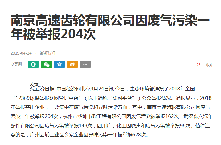 2019年,我司對南京高速齒輪有限公司的展開了環境檢測,該公司廢氣和異味一年被舉報數百次(下圖為新聞截圖)。